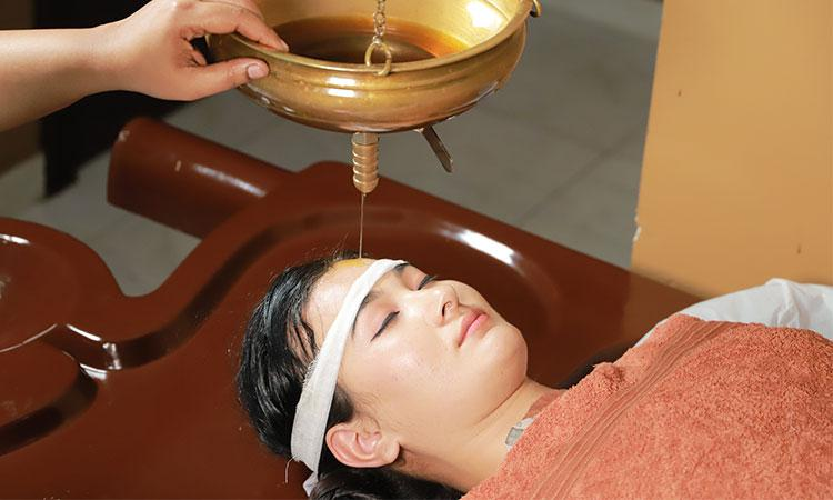 #शिरोधारा -therapy that involves the gentle pouring of a continuous stream of warm herbal oil, milk, or buttermilk onto the forehead, specifically on the "third eye" area, which is believed to be the seat of human consciousness in Ayurveda. The